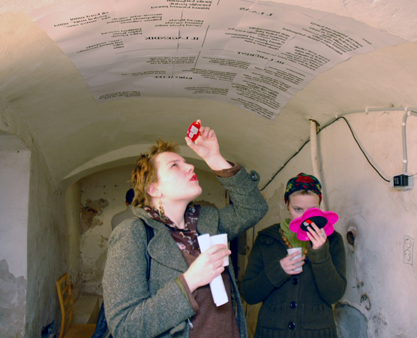 .Conceptual writing: an unexpected performance. Unknown policeman (on the right) is writing a record on criminal act - the sentence „nothing can be more essential than this sentence” was painted on a real estate without permission of the owner! On the left: Erkki Luuk (mag.phil), the father of estonian experimental literature.