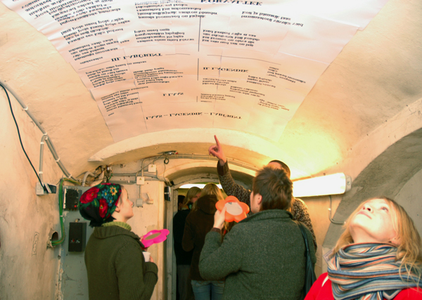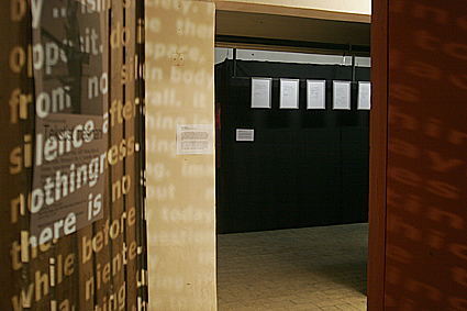.14NÜ is a legendary litearature group whose practice is usually something between attack and research –both physical and psychical- revolving around the meaning of author, the book as an object and the ontology of text. In this work they use the medical attribute – a cabinet of the eye, where the table for the eyesight control is displaced with their own text.