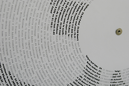 .The authors have used received e-mails – qualified as spam – from the year 2007 and ascii art, the widespread symbol of OM from hinduism and buddhism and the allegory between a vinyl record and a spiral as elements of their work.